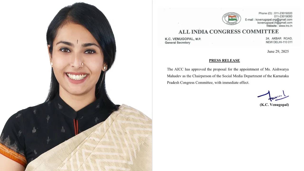 ಕಾಂಗ್ರೆಸ್ನ ರಾಷ್ಟ್ರೀಯ ಮಾಧ್ಯಮ ಸಮಿತಿ ಸದಸ್ಯೆ ಐಶ್ವರ್ಯಾ ಮಹಾದೇವ್ ಅವರನ್ನು ಕೆಪಿಸಿಸಿಯ ಸಾಮಾಜಿಕ ಮಾಧ್ಯಮ ವಿಭಾಗದ ಅಧ್ಯಕ್ಷರನ್ನಾಗಿ ಭಾನುವಾರ ನೇಮಿಸಲಾಗಿದೆ. ಕರ್ನಾಟಕ ಪ್ರದೇಶ ಕಾಂಗ್ರೆಸ್ ಸಮಿತಿಯ ಸಾಮಾಜಿಕ ಮಾಧ್ಯಮ ವಿಭಾಗದ ಅಧ್ಯಕ್ಷೆಯಾಗಿ ಐಶ್ವರ್ಯಾ ಮಹಾದೇವ್ ಅವರನ್ನು ನೇಮಕ ಮಾಡುವ ಪ್ರಸ್ತಾವನೆಯನ್ನು ಎಐಸಿಸಿ ತಕ್ಷಣದಿಂದ ಜಾರಿಗೆ ಬರುವಂತೆ ಅನುಮೋದಿಸಿದೆ ಎಂದು ಎಐಸಿಸಿ ಪ್ರಧಾನ ಕಾರ್ಯದರ್ಶಿ ಕೆಸಿ ವೇಣುಗೋಪಾಲ್ ಪತ್ರಿಕಾ ಪ್ರಕಟಣೆಯಲ್ಲಿ ತಿಳಿಸಿದ್ದಾರೆ.