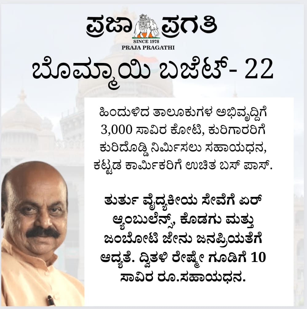 ಕರ್ನಾಟಕದ ಬೊಮ್ಮಾಯಿ ಬಜೆಟ್ – 2022March 4, 2022By Prajapragathi50ತುಮಕೂರುಬೆಂಗಳೂರುರಾಜ್ಯ ಪ್ರಜಾಪ್ರಗತಿಯಿಂದ ತಾಜಾ ಸುದ್ದಿಗಾಗಿ ಪ್ರಜಾಪ್ರಗತಿ facebook page ಲೈಕ್ ಮಾಡಿ Share via: Facebook WhatsApp Telegram Twitter More Recent Articlesನಾನೊಬ್ಬ ಭಾರತೀಯ ಎಂಬುದನ್ನು ಮರೆ ಮಾಚಿದೆ; ಬಾಂಗ್ಲಾದಿಂದ ತಪ್ಪಿಸಿಕೊಂಡವರು ಹೇಳಿದ್ದೇನು? Lead News December 22, 2025 ಹಳೆಯ ವಿದ್ಯಾರ್ಥಿಗಳೇ ಮಠದ ನಿಧಿ: ಸಿದ್ಧಲಿಂಗ ಸ್ವಾಮೀಜಿ Lead News December 22, 2025 ರೌಡಿ ಹತ್ಯೆ ಪ್ರಕರಣದಲ್ಲಿ ಶಾಸಕ ಬೈರತಿ ಬಸವರಾಜುಗೆ ಲುಕ್ಔಟ್ ನೋಟಿಸ್ ಸಾಧ್ಯತೆ Lead News December 22, 2025 ಕುಕ್ಕೆ ಸುಬ್ರಹ್ಮಣ್ಯದಲ್ಲಿ ಕಿರುಷಷ್ಠಿ, ಅನ್ಯಧರ್ಮೀಯರಿಗೆ ಆಹ್ವಾನಕ್ಕೆ ವಿರೋಧ Lead News December 22, 2025 ಒತ್ತಡ ನಡುವೆ ಖಾಸಗಿ ಬದುಕಿಗೂ ಆದ್ಯತೆ ನೀಡಿ….! Lead News December 22, 2025 Related Stories Lead Newsಹಳೆಯ ವಿದ್ಯಾರ್ಥಿಗಳೇ ಮಠದ ನಿಧಿ: ಸಿದ್ಧಲಿಂಗ ಸ್ವಾಮೀಜಿ Prajapragathi - December 22, 2025 Lead Newsರೌಡಿ ಹತ್ಯೆ ಪ್ರಕರಣದಲ್ಲಿ ಶಾಸಕ ಬೈರತಿ ಬಸವರಾಜುಗೆ ಲುಕ್ಔಟ್ ನೋಟಿಸ್ ಸಾಧ್ಯತೆ Prajapragathi - December 22, 2025 Lead Newsಕುಕ್ಕೆ ಸುಬ್ರಹ್ಮಣ್ಯದಲ್ಲಿ ಕಿರುಷಷ್ಠಿ, ಅನ್ಯಧರ್ಮೀಯರಿಗೆ ಆಹ್ವಾನಕ್ಕೆ ವಿರೋಧ Prajapragathi - December 22, 2025 Lead Newsಒತ್ತಡ ನಡುವೆ ಖಾಸಗಿ ಬದುಕಿಗೂ ಆದ್ಯತೆ ನೀಡಿ….! Prajapragathi - December 22, 2025 Lead Newsಪಾಕ್ ಪರ ಬೇಹುಗಾರಿಕೆ, ಉಡುಪಿಯಲ್ಲಿ ಮೂರನೇ ವ್ಯಕ್ತಿ ಬಂಧನ Prajapragathi - December 22, 2025