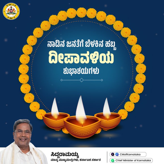 ನಾಡಿನಾದ್ಯಂತ ಬೆಳಕಿನ ಹಬ್ಬ ದೀಪಾವಳಿ ಹಬ್ಬದ ಸಂಭ್ರಮ ಮನೆ ಮಾಡಿದ್ದು, ಈ ಹಿನ್ನೆಲೆಯಲ್ಲಿ ಮುಖ್ಯಮಂತ್ರಿ ಸಿದ್ದರಾಮಯ್ಯ ಅವರು ರಾಜ್ಯದ ಜನತೆಗೆ ಶುಭಾಶಯಗಳನ್ನು ಕೋರಿದ್ದಾರೆ.