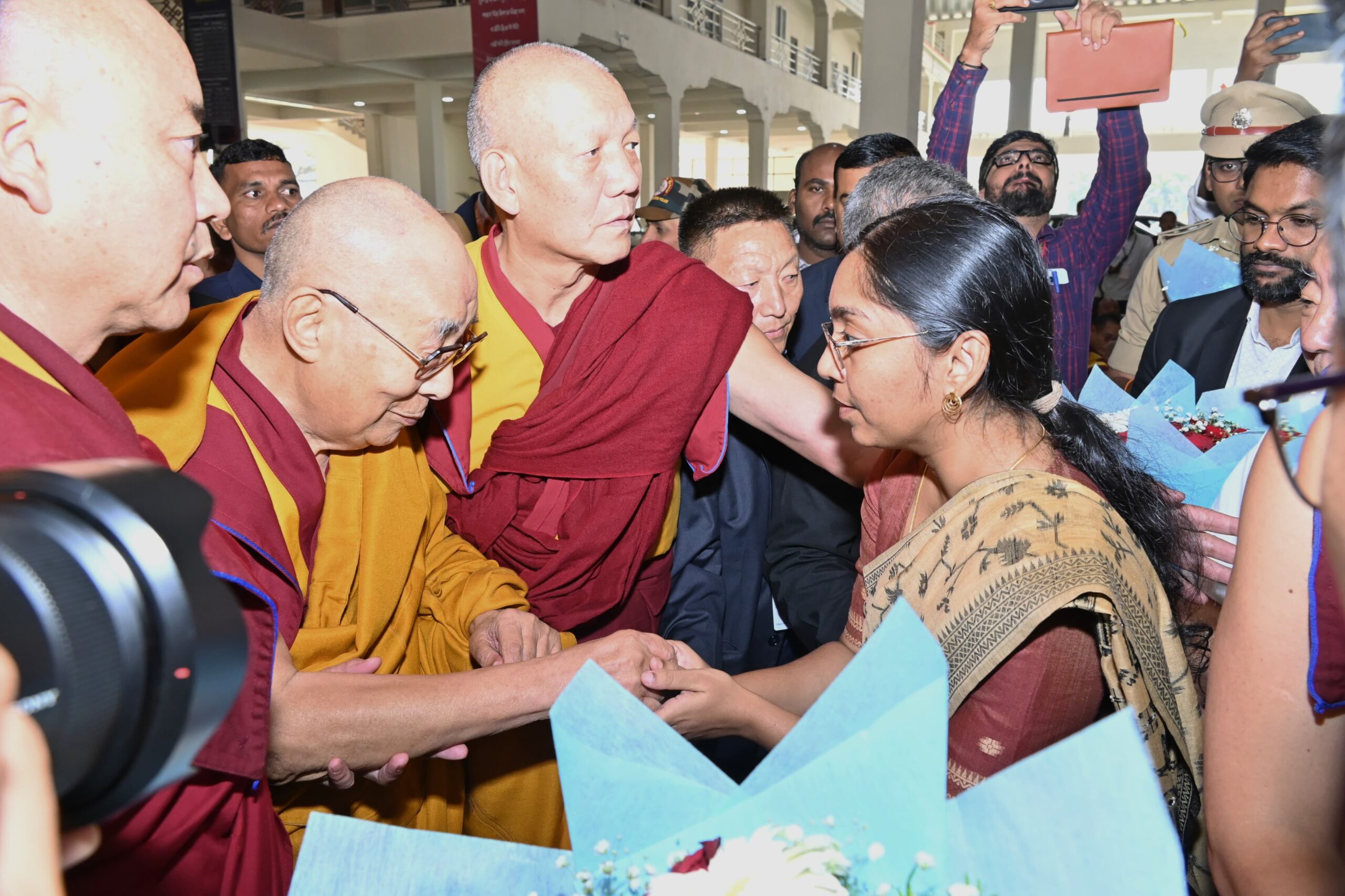ಮುಂಜಾನೆ 11.30 ಸುಮಾರಿಗೆ ಕ್ಯಾಂಪ್ ನಂಬರ್ 6 ರ ಗುಮಾಂಗ್ ಮೊನೆಸ್ಟ್ರಿಯ ಡ್ರಿಪೋಂಗ್ ಹಾಲ್ ಗೆ ಬಂದಿಳಿದ ದಲಾಯಿ ಲಾಮಾ ಅವರಿಗೆ ಜಿಲ್ಲಾಡಳಿತದ ಪರವಾಗಿ ಜಿಲ್ಲಾಧಿಕಾರಿ ಕೆ ಲಕ್ಷ್ಮಿಪ್ರಿಯಾ ಹಾಗೂ ಜಿಲ್ಲಾ ಪಂಚಾಯತ್ ಸಿಇಓ ದಿಲೀಪ್ ಶಸಿ ಹೂಗುಚ್ಛ ನೀಡುವ ಮೂಲಕ ಸ್ವಾಗತಿಸಿದರು. ಈ ವೇಳೆ ಎಸ್ಪಿ ದೀಪನ್ ಎಂ ಎನ್, ಹೆಚ್ಚುವರಿ ಎಸ್ಪಿ ಕೃಷ್ಣಮೂರ್ತಿ,ಎಸಿ ಕಾವ್ಯಾ ರಾಣಿ, ಡಿಎಸ್ಪಿ ಗೀತಾ ಪಾಟೀಲ್ ,ತಹಶೀಲ್ದಾರ್ ಶಂಕರ್ ಗೌಡಿ, ತಾಲೂಕ ಪಂಚಾಯತ್ ಇಓ ಟಿ ವಾಯ್ ದಾಸನಕೊಪ್ಪ ಸೇರಿದಂತೆ ಅಧಿಕಾರಿಗಳು ಉಪಸ್ಥಿತರಿದ್ದರು.