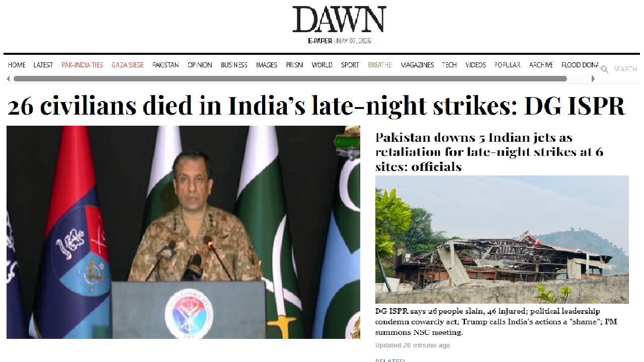ಒಂದು ಕಡೆ ಭಾರತದ ಆಪರೇಶನ್‌ ಸಿಂಧೂರ್‌ ಹೆಸರಿನ ವಾಯುದಾಳಿಯಲ್ಲಿ  ಪಾಕಿಸ್ತಾನದ ಉಗ್ರಗಾಮಿಗಳು ಲಬೋ ಲಬೋ ಎನ್ನುತ್ತಿದ್ದರೆ, ಇನ್ನೊಂದು ಕಡೆ ಅಲ್ಲಿನ ಕೆಲವು ಮೀಡಿಯಾಗಳು ಭಾರತದ ವಿರುದ್ಧ ವರದಿ ಮಾಡುವುದರಲ್ಲಿ ತೊಡಗಿವೆ. ಪಾಕ್‌ ಮೀಡಿಯಾಗಳಲ್ಲಿ ಪ್ರಮುಖವಾಗಿರುವ ʼಡಾನ್‌ʼ ಇಂದು ದಾಳಿಯ ಬಳಿಕ ತನ್ನ ವೆಬ್‌ಸೈಟ್‌ನಲ್ಲಿ “ಭಾರತದ ಐದು ಜೆಟ್‌ಗಳನ್ನು ಪಾಕಿಸ್ತಾನದ ಸೇನೆ ಹೊಡೆದುರುಳಿಸಿದೆʼ ಎಂದು ವರದಿ ಮಾಡಿ ಹಾಸ್ಯಕ್ಕೆ ಒಳಗಾಯಿತು. ʼಭಾರತ ದಾಳಿ ನಡೆಸಿ 26 ಪಾಕಿಸ್ತಾನಿ ನಾಗರಿಕರನ್ನು ಕೊಂದಿದೆʼ ಎಂದು ಕೂಡ ಇದು ವರದಿ ಮಾಡಿದೆ.