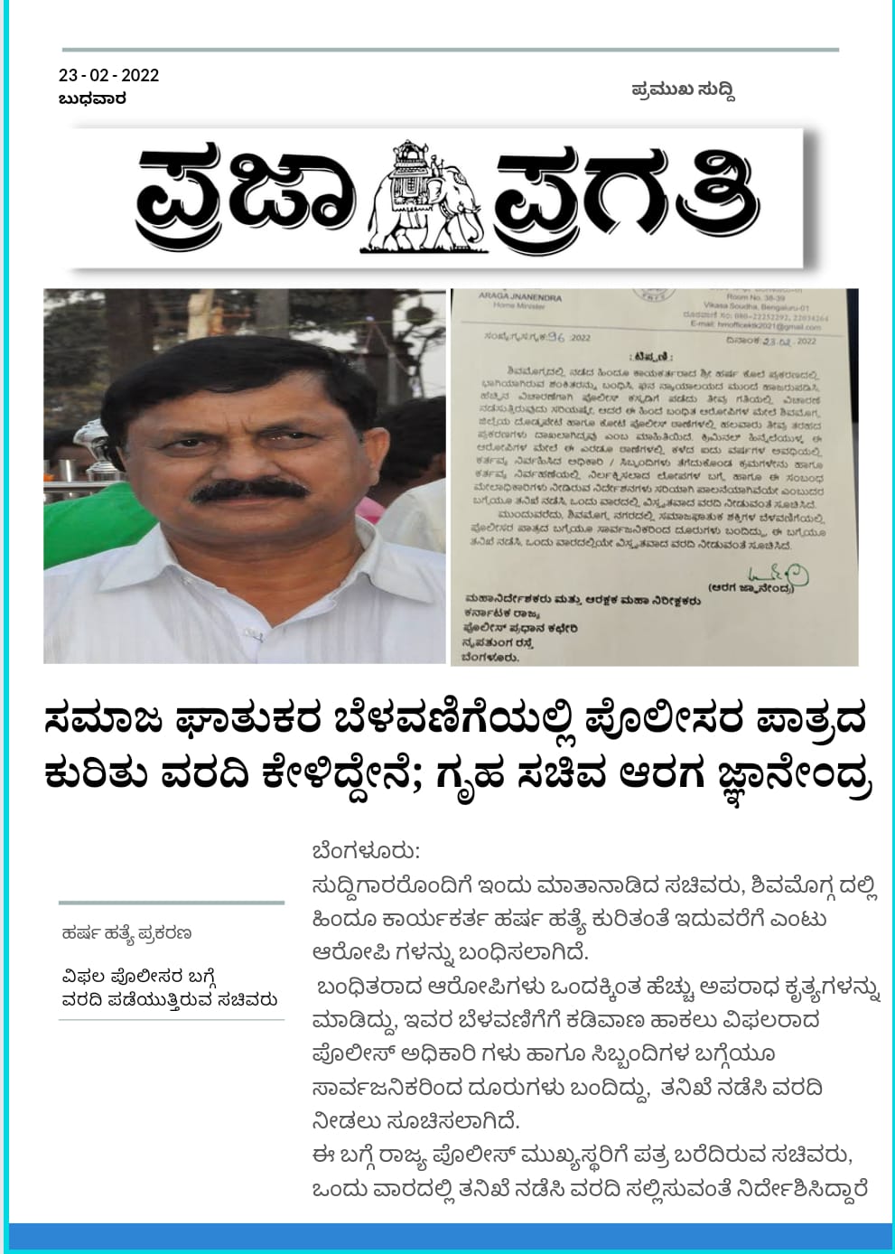ಸಮಾಜ ಘಾತುಕರ ಬೆಳವಣಿಗೆಯಲ್ಲಿ ಪೊಲೀಸರ ಪಾತ್ರದ ಕುರಿತು ವರದಿ ಕೇಳಿದ್ದೆನೆ; ಗೃಹ ಸಚಿವ ಆರಗ ಜ್ಙಾನೇಂದ್ರ