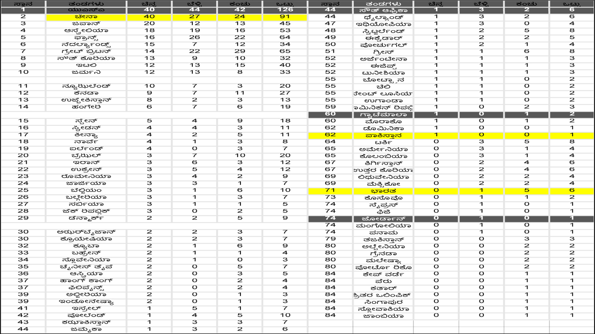 ರಾಜಧಾನಿಯಲ್ಲಿ ನಡೆದ ಈ ಬಾರಿಯ ಕ್ರೀಡಾಕೂಟದಲ್ಲಿ 200 ಕ್ಕೂ ಆಧಿಕ ದೇಶಗಳು ಭಾಗವಹಿಸಿದ್ದವು. ಅಲ್ಲದೆ 9 ಸಾವಿರಕ್ಕೂ ಅಧಿಕ ಕ್ರೀಡಾಪಟುಗಳು ಕಣಕ್ಕಿಳಿದಿದ್ದರು. ಇವರಲ್ಲಿ ಅತ್ಯಧಿಕ ಪದಕ ಗೆದ್ದ ದೇಶವೆಂದರೆ ಯುನೈಟೆಡ್ ಸ್ಟೇಟ್ ಆಫ್ ಅಮೆರಿಕ. ಒಟ್ಟು 126 ಪದಕಗಳೊಂದಿಗೆ ಯುಎಸ್ಎ ಅಗ್ರಸ್ಥಾನ ಅಲಂಕರಿಸಿದರೆ, 91 ಪದಕಗಳೊಂದಿಗೆ ಚೀನಾ ದ್ವಿತೀಯ ಸ್ಥಾನ ಅಲಂಕರಿಸಿತು. ಪ್ಯಾರಿಸ್ ಒಲಿಂಪಿಕ್ಸ್​ನಲ್ಲಿ ಅತೀ ಹೆಚ್ಚು ಪದಕಗಳನ್ನು ಗೆದ್ದ ದೇಶಗಳ ಪಟ್ಟಿ ಈ ಕೆಳಗಿನಂತಿದೆ.