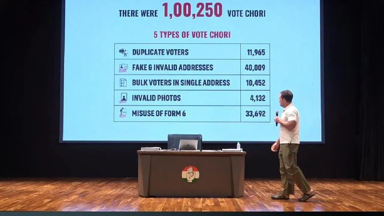 ಕರ್ನಾಟಕದ ಮತದಾರರ ಪಟ್ಟಿಗಳಲ್ಲಿ ವಂಚನೆ ನಡೆದಿದೆ ಎಂದು ರಾಹುಲ್ ಗಾಂಧಿ ಗಂಭೀರ ಆರೋಪ ಮಾಡಿದ್ದು, ಕರ್ನಾಟಕದಲ್ಲಿ 40,009 ನಕಲಿ ಮತದಾರರ ವಿಳಾಸಗಳಿವೆ ಎಂದಿದ್ದಾರೆ. ಕಾಂಗ್ರೆಸ್ ನಡೆಸಿದ’ವೋಟ್ ಚೋರಿ’ ತನಿಖೆಯಲ್ಲಿ ‘ಮನೆ ಸಂಖ್ಯೆ 0’ಎಂದು ಉಲ್ಲೇಖಿಸಿರುವುದಾಗಿ ರಾಹುಲ್ ಗಾಂಧಿ ಆರೋಪಿಸಿದ್ದಾರೆ. ಇಂದು ಪತ್ರಿಕಾಗೋಷ್ಠಿಯನ್ನುದ್ದೇಶಿಸಿ ಮಾತನಾಡಿದ ರಾಹುಲ್ ಗಾಂಧಿ, ಚುನಾವಣಾ ಆಯೋಗವು ಮತಗಳನ್ನು ಕದಿಯಲು ಬಿಜೆಪಿಯೊಂದಿಗೆ ಕೈಜೋಡಿಸಿದೆ. ಮತದಾರರ ಪಟ್ಟಿಗಳಿಗೆ ನಕಲಿ ಜನರನ್ನು ಸೇರಿಸಲಾಗುತ್ತಿದೆ ಎಂದಿದ್ದಾರೆ. ಕರ್ನಾಟಕ ಮತದಾರರ ಪಟ್ಟಿಯನ್ನು ತೋರಿಸುವ ಮೂಲಕ ಅವರು ತಮ್ಮ ಆರೋಪಕ್ಕೆ ಸಾಕ್ಷಿ ಒದಗಿಸಿದ್ದಾರೆ.
