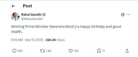 ಎಕ್ಸ್ನಲ್ಲಿ ಪೋಸ್ಟ್ವೊಂದನ್ನು ಮಾಡಿರುವ ರಾಹುಲ್ ಗಾಂಧಿ, ಪ್ರಧಾನಮಂತ್ರಿ ನರೇಂದ್ರ ಮೋದಿ ಅವರಿಗೆ ಹುಟ್ಟುಹಬ್ಬದ ಶುಭಾಶಯಗಳು ಮತ್ತು ಉತ್ತಮ ಆರೋಗ್ಯವನ್ನು ಹಾರೈಸುತ್ತೇನೆ ಎಂದು ಬರೆದಿದ್ದಾರೆ. ಕಾಂಗ್ರೆಸ್ ಅಧ್ಯಕ್ಷ ಮಲ್ಲಿಕಾರ್ಜುನ ಖರ್ಗೆ ಕೂಡ ಪ್ರಧಾನಿ ಮೋದಿ ಅವರಿಗೆ ಹುಟ್ಟುಹಬ್ಬದ ಶುಭಾಶಯಗಳನ್ನು ಕೋರಿದ್ದಾರೆ. ಖರ್ಗೆ ಅವರು X ನಲ್ಲಿ ಪೋಸ್ಟ್ನಲ್ಲಿ, “ಪ್ರಧಾನಮಂತ್ರಿ ನರೇಂದ್ರ ಮೋದಿ ಅವರಿಗೆ ಹುಟ್ಟುಹಬ್ಬದ ಶುಭಾಶಯಗಳು. ಅವರಿಗೆ ಉತ್ತಮ ಆರೋಗ್ಯ ಮತ್ತು ದೀರ್ಘಾಯುಷ್ಯವನ್ನು ದೇವರು ಕರುಣಿಸಲಿ ಎಂದು ಹಾರೈಸಿದ್ದಾರೆ.