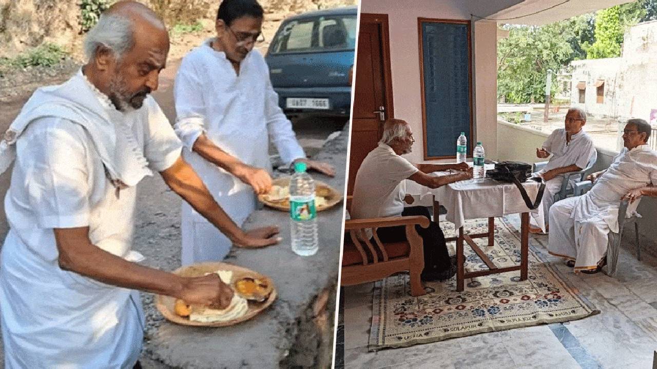 ನಟ ಸೂಪರ್ ಸ್ಟಾರ್ ರಜನೀಕಾಂತ್ ಅವರ ಈ ಫೋಟೋ ಗಳು ಸೋಶಿಯಲ್ ಮಿಡಿಯಾದಲ್ಲಿ ಸಂಚಲನ ಉಂಟು ಮಾಡುತ್ತಿದೆ. ವೈರಲ್ ಆದ ಫೋಟೊದಲ್ಲಿ ರಜನಿಕಾಂತ್ ಅವರ ಸರಳತ್ವ ನೆಟ್ಟಿಗರ ಗಮನ ಸೆಳೆಯುವಂತೆ ಮಾಡುತ್ತಿದೆ. ಬಿಳಿ ಬಟ್ಟೆಗಳನ್ನು ಧರಿಸಿ ಸಾಮಾನ್ಯ ಹಳ್ಳಿಯವರಂತೆ ಅವರು ಕಂಡಿದ್ದಾರೆ. ರಸ್ತೆ ಬದಿಯಲ್ಲಿ ಕಲ್ಲಿನ ಮೇಲೆ ಇಟ್ಟಿದ್ದ ಎಲೆಯೊಂದರ ತಟ್ಟೆಯಲ್ಲಿ ಬಡಿಸಿದ ಆಹಾರವನ್ನು ಅವರು ತಿನ್ನುತ್ತಿರಯವ ದೃಶ್ಯಗಳನ್ನು ಫೋಟೊದಲ್ಲಿ ಕಾಣಬಹುದು.