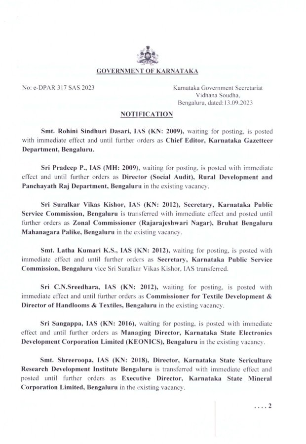 ಸಂಗಪ್ಪ ಅವರನ್ನು ಕಿಯೋನಿಸ್ಕ್ ನಿರ್ದೇಶಕರಾಗಿ ನೇಮಕ ಮಾಡಲಾಗಿದೆ.ರೇಷ್ಮೆ ಸಂಶೋಧನಾ ಅಭಿವೃದ್ಧಿ ಮಂಡಳಿಯ ನಿರ್ದೇಶಕರಾಗಿದ್ದ ಶ್ರೀರೂಪಾ ಅವರನ್ನು ಕರ್ನಾಟಕ ರಾಜ್ಯ ಮಿನರಲ್ಸ್ ಕಾರ್ಪೋರೇಷನ್ ಕಾರ್ಯಕಾರಿ ನಿರ್ದೇಶಕರಾಗಿ ನೇಮಕ ಮಾಡಲಾಗಿದೆ.