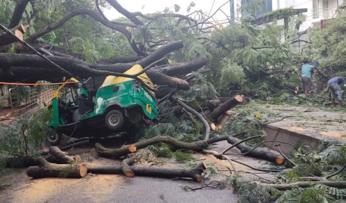 ಸಿಲಿಕಾನ್ ಸಿಟಿಯಲ್ಲಿ ಬೃಹತ್ ಗಾತ್ರದ ಮರವೊಂದು ಉರುಳಿ ಬಿದ್ದ ಪರಿಣಾಮ ಆಟೋವೊಂದು ಸಂಪೂರ್ಣ ಜಖಂಗೊಂಡಿದೆ.