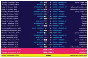ಸೆಮಿಫೈನಲ್ ಪಂದ್ಯಗಳು ಸಿಡ್ನಿ ಕ್ರಿಕೆಟ್ ಗ್ರೌಂಡ್ ಹಾಗೂ ಅಡಿಲೇಡ್ನಲ್ಲಿ ನಡೆಯಲಿದೆ. ನವೆಂಬರ್ 9 ಹಾಗೂ 10ರಂದು ಈ ಪಂದ್ಯಗಳು ನಡೆಯಲಿದೆ. ಫೈನಲ್ ಪಂದ್ಯ ನವೆಂಬರ್ 13ರಂದು ಮೆಲ್ಬರ್ನ್ ಕ್ರಿಕೆಟ್ ಗ್ರೌಂಡ್ನಲ್ಲಿ ನಡೆಯಲಿದೆ.